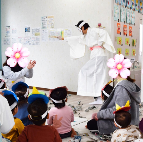飯塚ママー保育園のみんなにたくさん福がくるように、福の舞を踊ってくれました。